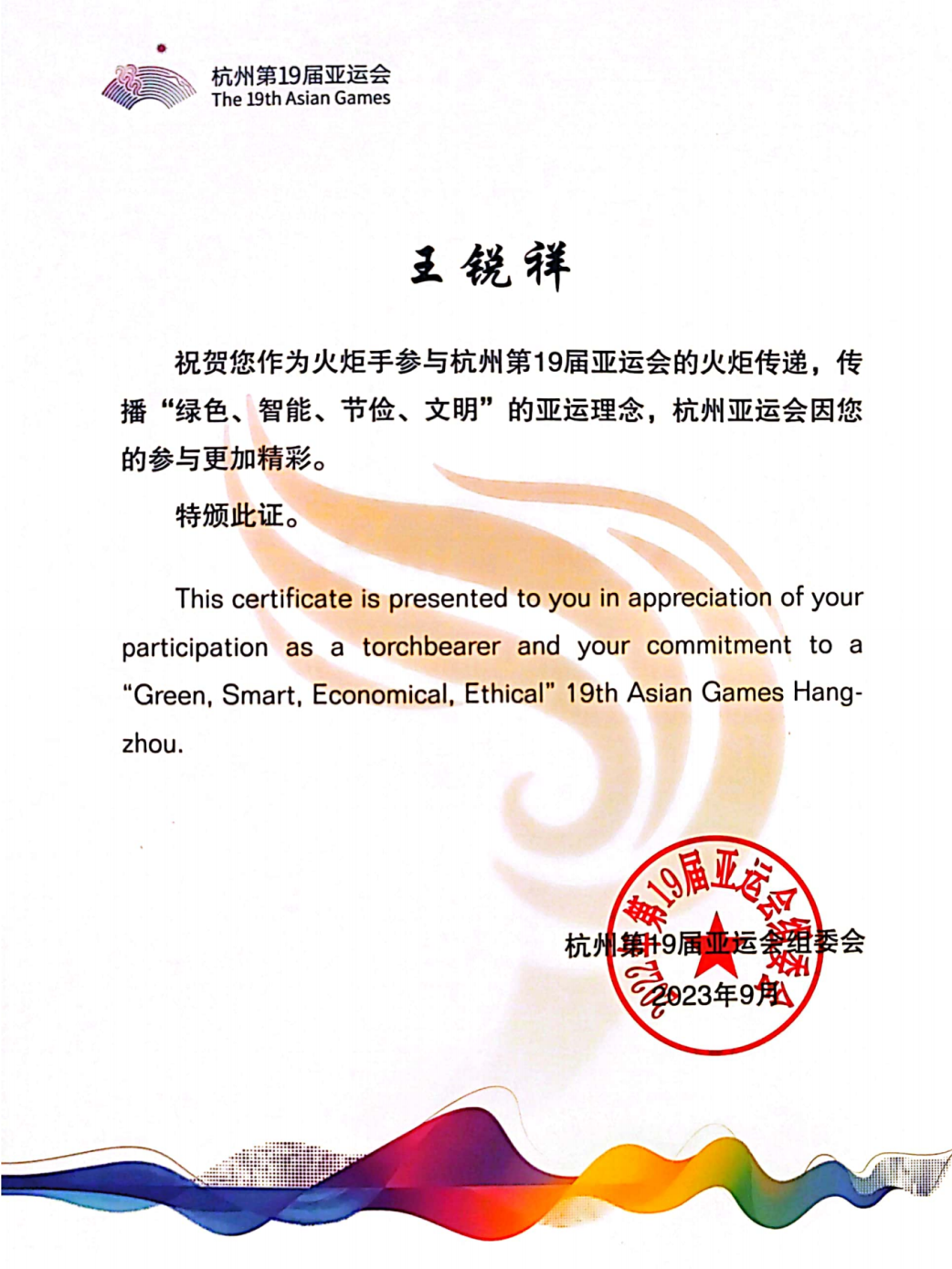 ▲杭州第19届亚运会组委会颁发给王锐祥的《火炬手证书》