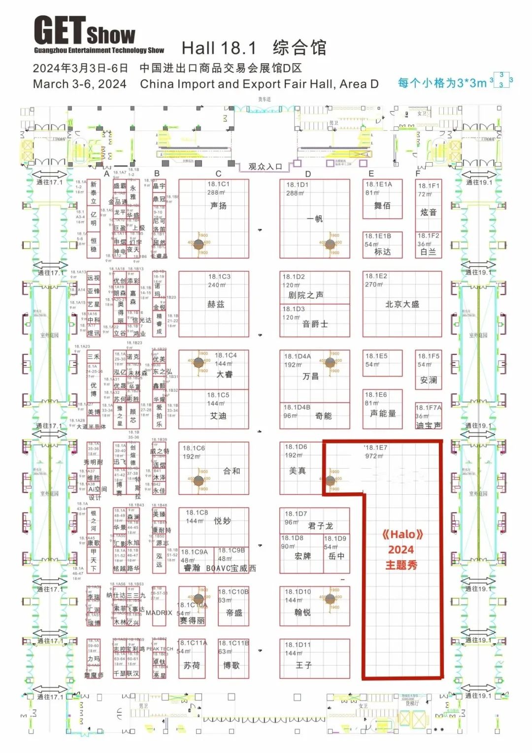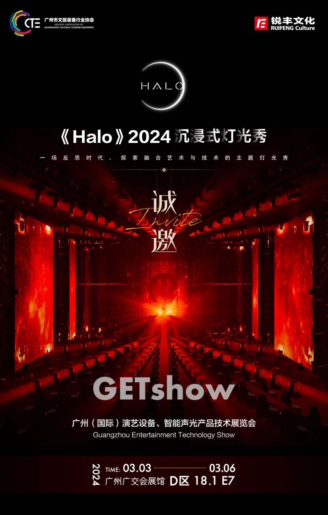 由广州市文旅装备行业协会主办,锐丰文化、视听联盟、影像骑士联合发起的沉浸式灯光主题秀——《Halo》,将于3月3日-6日在GETshowD区18.1E7展馆隆重推出。