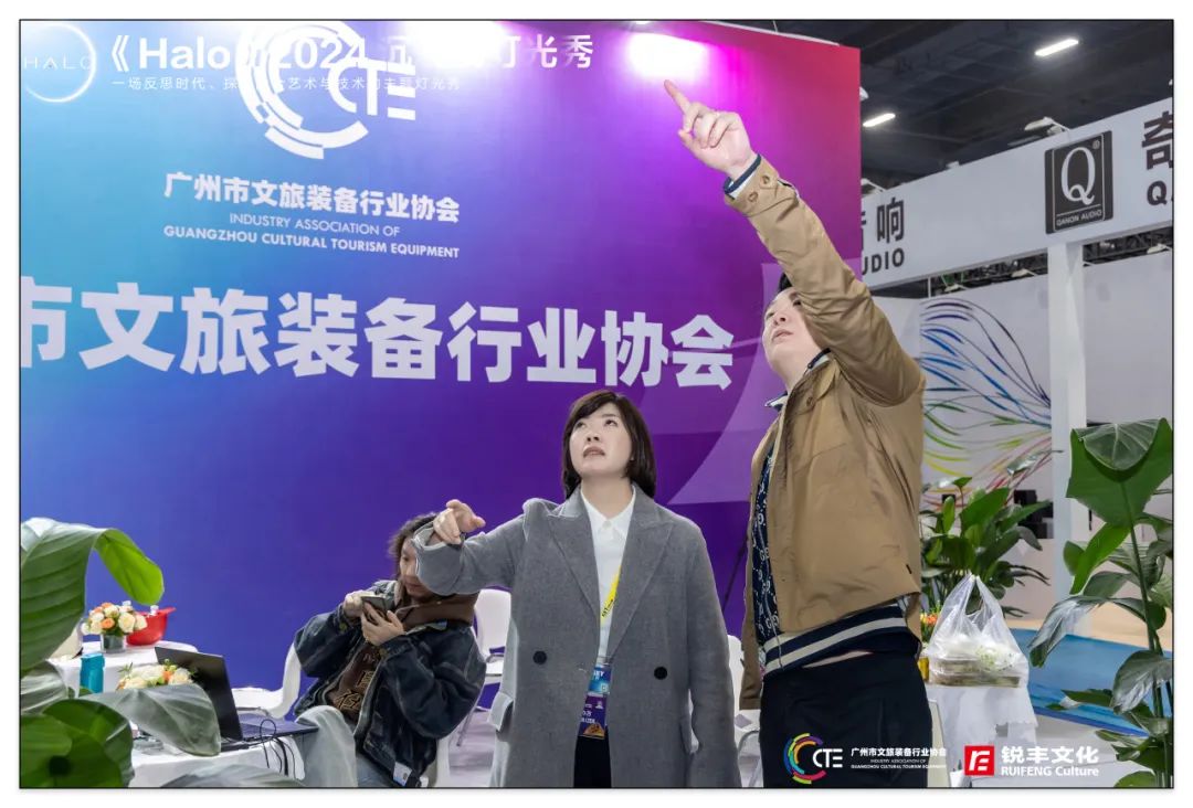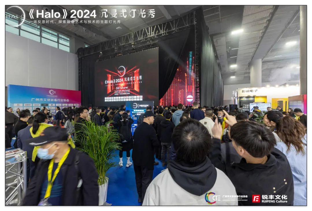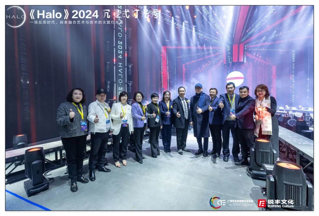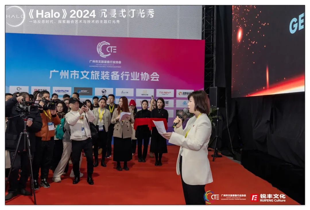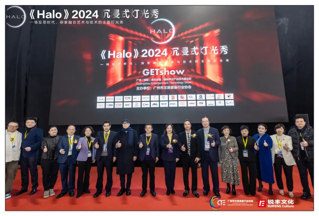 其中,由广州市文旅装备行业协会主办,协同带领文旅装备行业协会的会员单位共同打造的《Halo》2024沉浸式灯光秀也正式亮灯,省市领导及中国演艺设备行业协会等领导参与了《Halo》的点亮仪式。