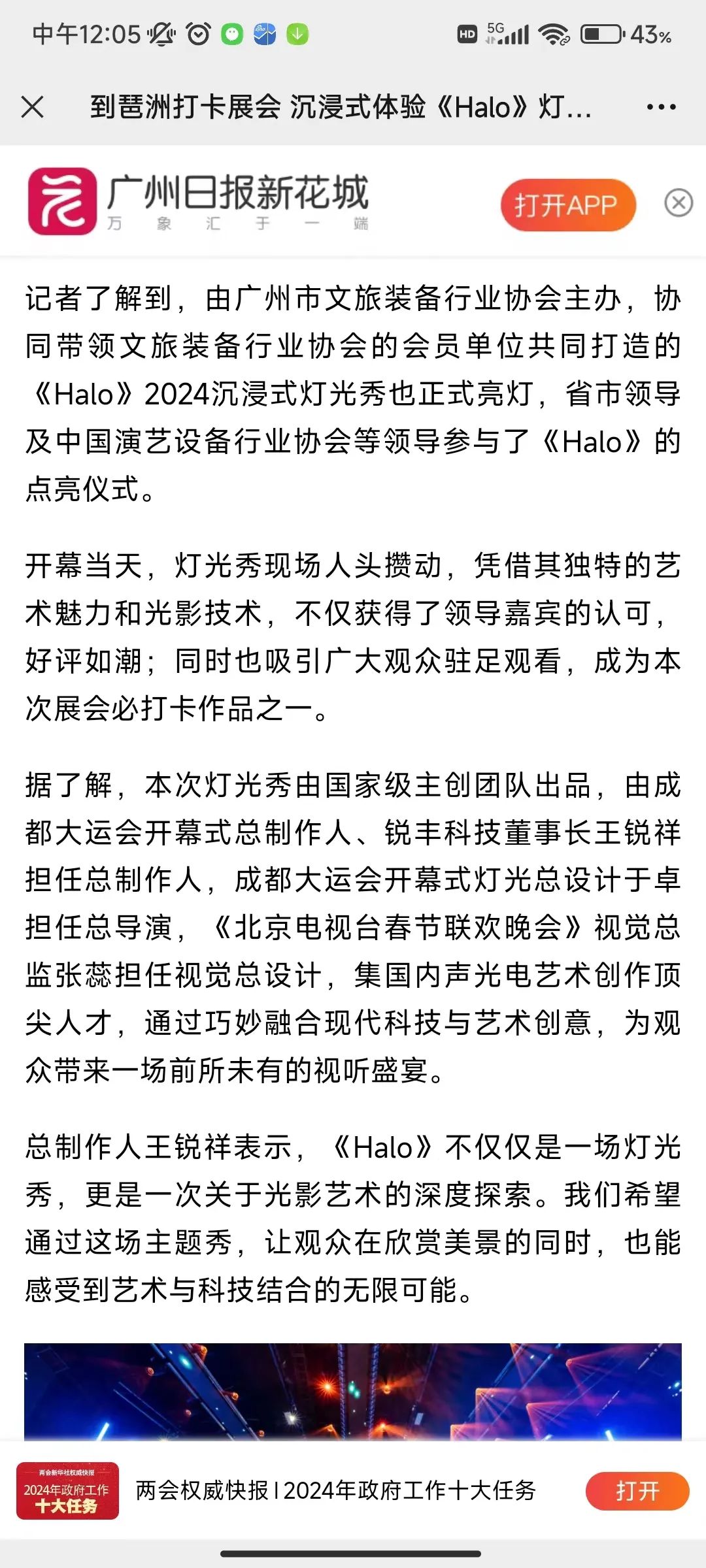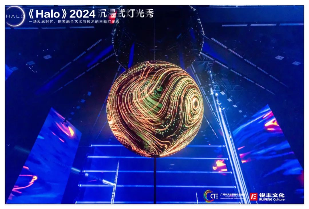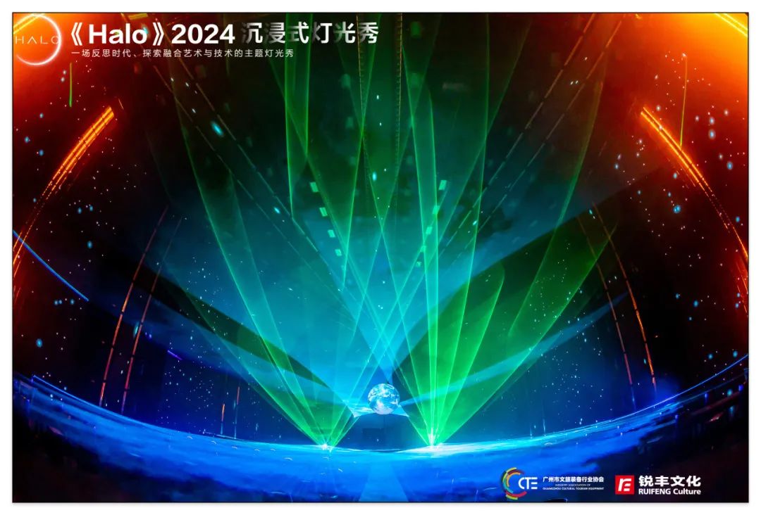 《Halo》由国际级主创团队亲自操刀,充分发挥好广州市文旅设备行业协会的引领作用,用好协会成员单位的“硬技术”力量,同时结合以光环为题,结合《宇宙》《生命》《创造》三大篇章阐述人工智能在艺术上的潜力,彰显“硬技术”赋能“软创意”的勃勃生机,演绎着中国式现代化文旅篇章的全新图景。