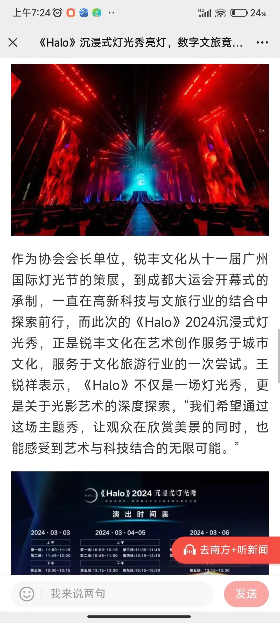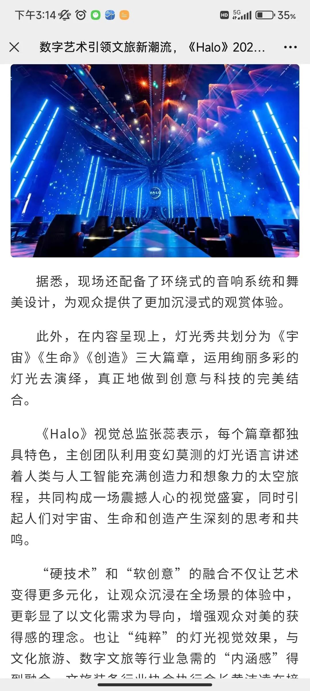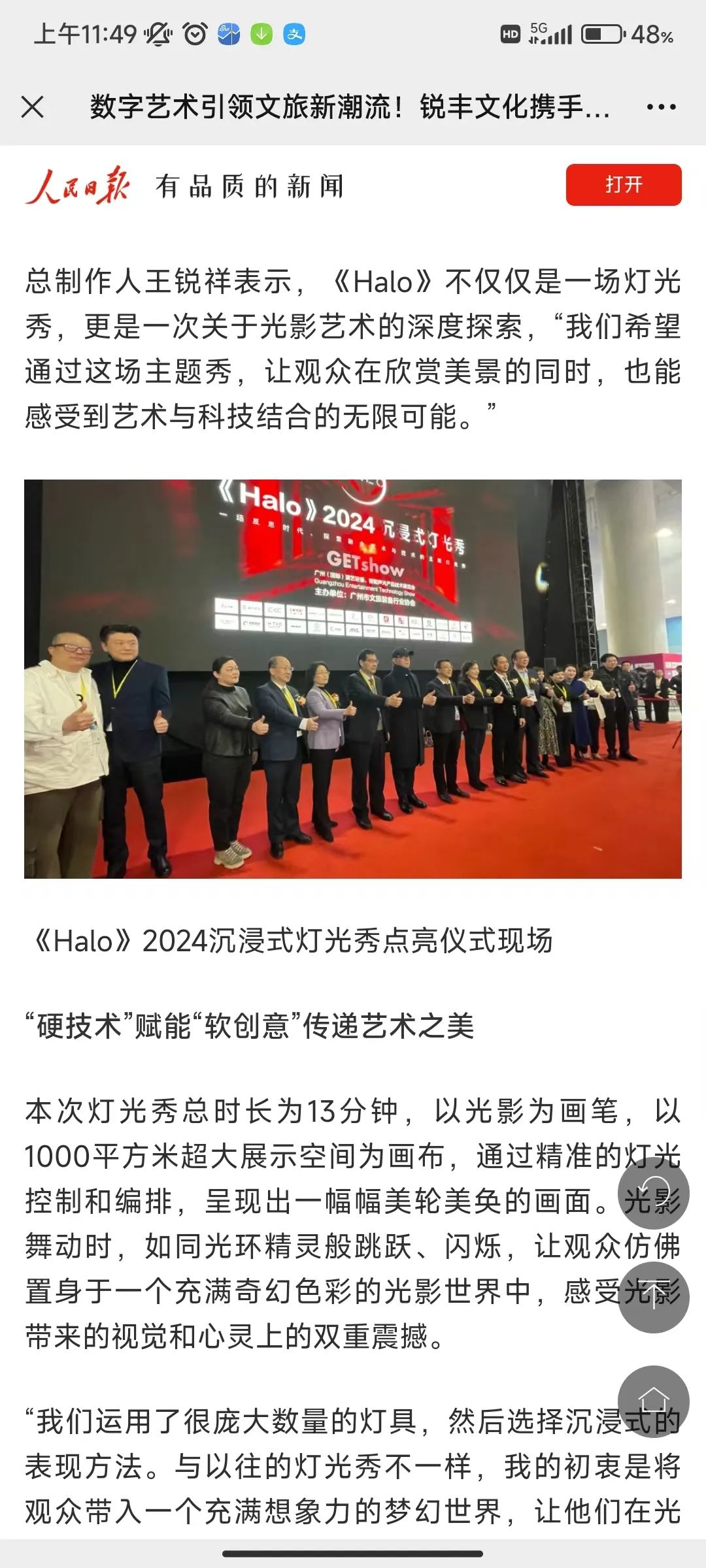 《Halo》由国际级主创团队亲自操刀,充分发挥好广州市文旅设备行业协会的引领作用,用好协会成员单位的“硬技术”力量,同时结合以光环为题,结合《宇宙》《生命》《创造》三大篇章阐述人工智能在艺术上的潜力,彰显“硬技术”赋能“软创意”的勃勃生机,演绎着中国式现代化文旅篇章的全新图景。