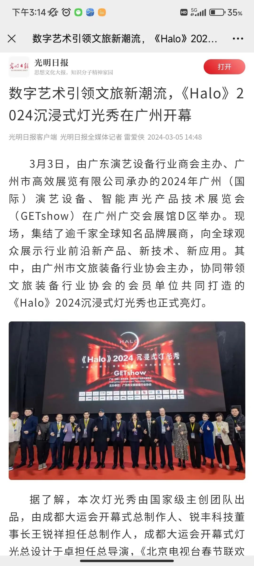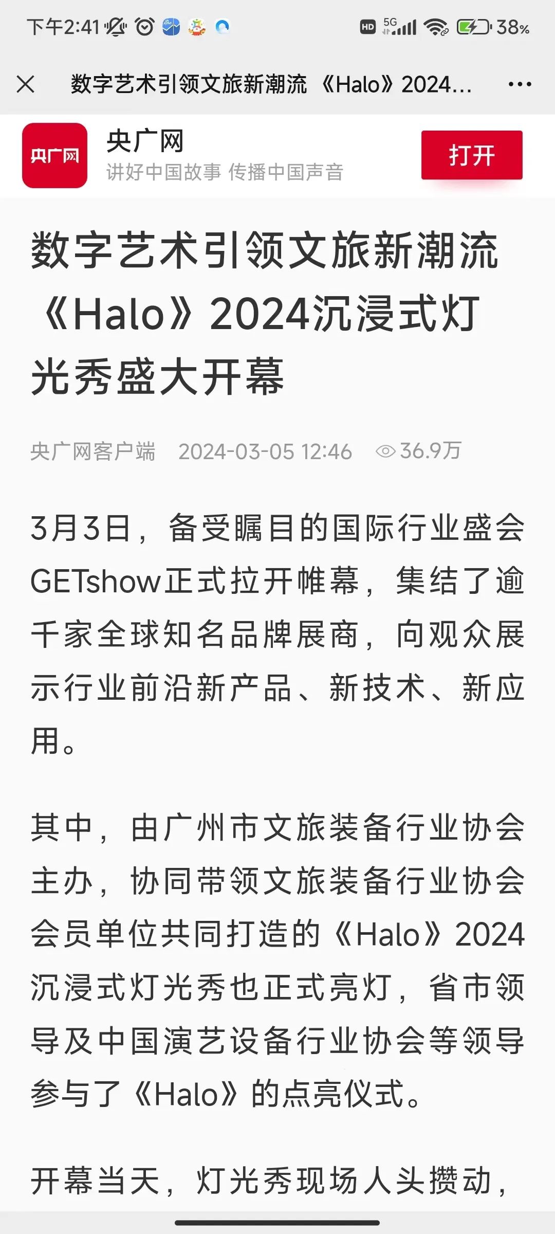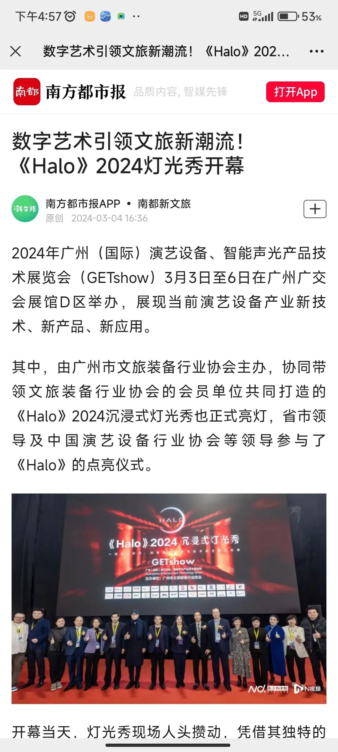 截至目前,灯光秀火爆全网,好评如潮,不仅获得了众多领导和嘉宾的认可,赢得了市民游客的点赞,成为了GETshow展会必打卡展位之一;同时也吸引了各界主流媒体、短视频自媒体等通过不同途径对《Halo》纷纷进行报道,累计发布内容上百篇,全网传播量超1000万!