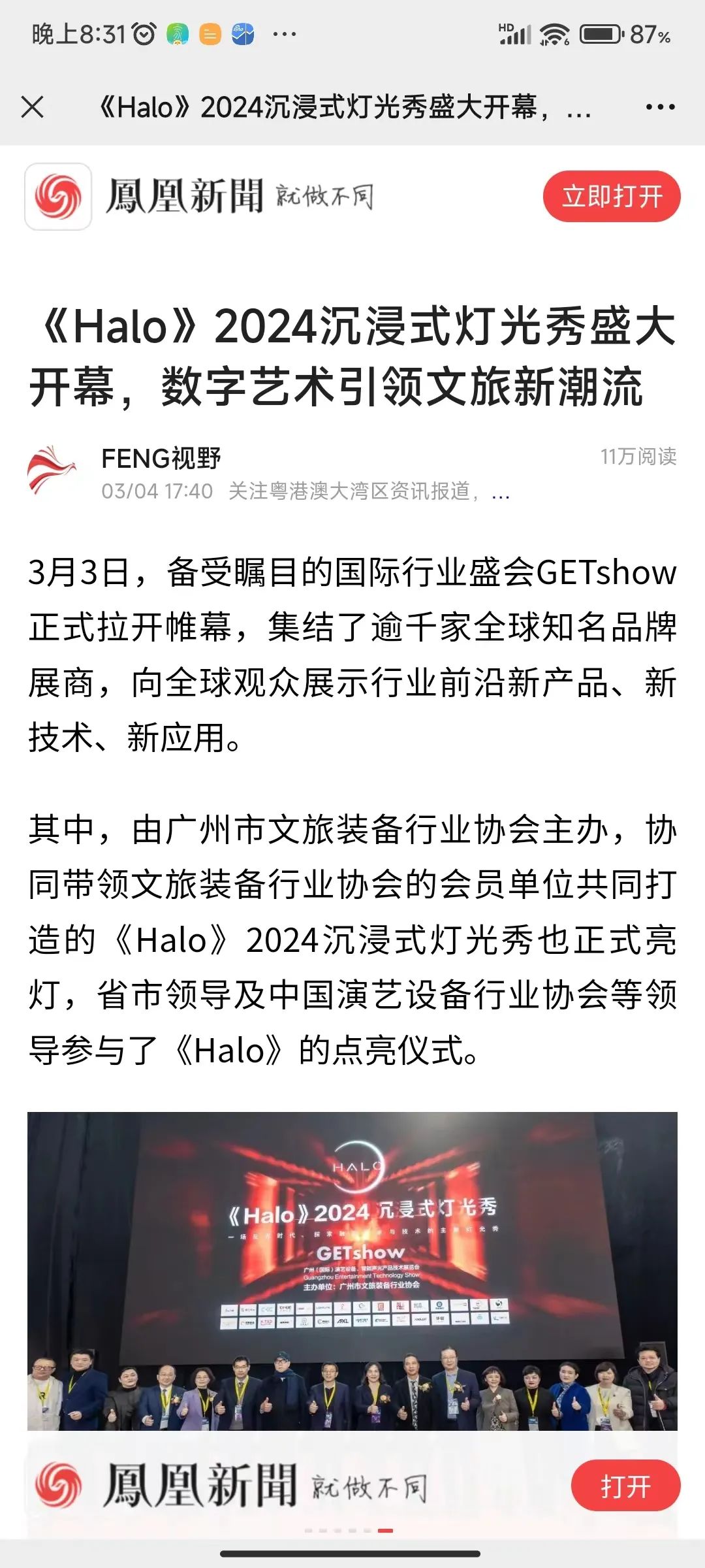 开幕至今,人民日报、央广网、光明日报、经济参考、中国周刊网、中国照明网、广东电视台、南方日报、南方都市报、广州电视台、广州日报、羊城晚报、新快报、凤凰新闻、香港商报等近30家国内主流媒体,对《Halo》进行持续跟踪报道,对灯光秀的艺术性、技术性以及文化内涵进行了充分的解读与剖析,让观众能更直观地感受《Halo》的震撼和魅力,累计阅读量超470万。